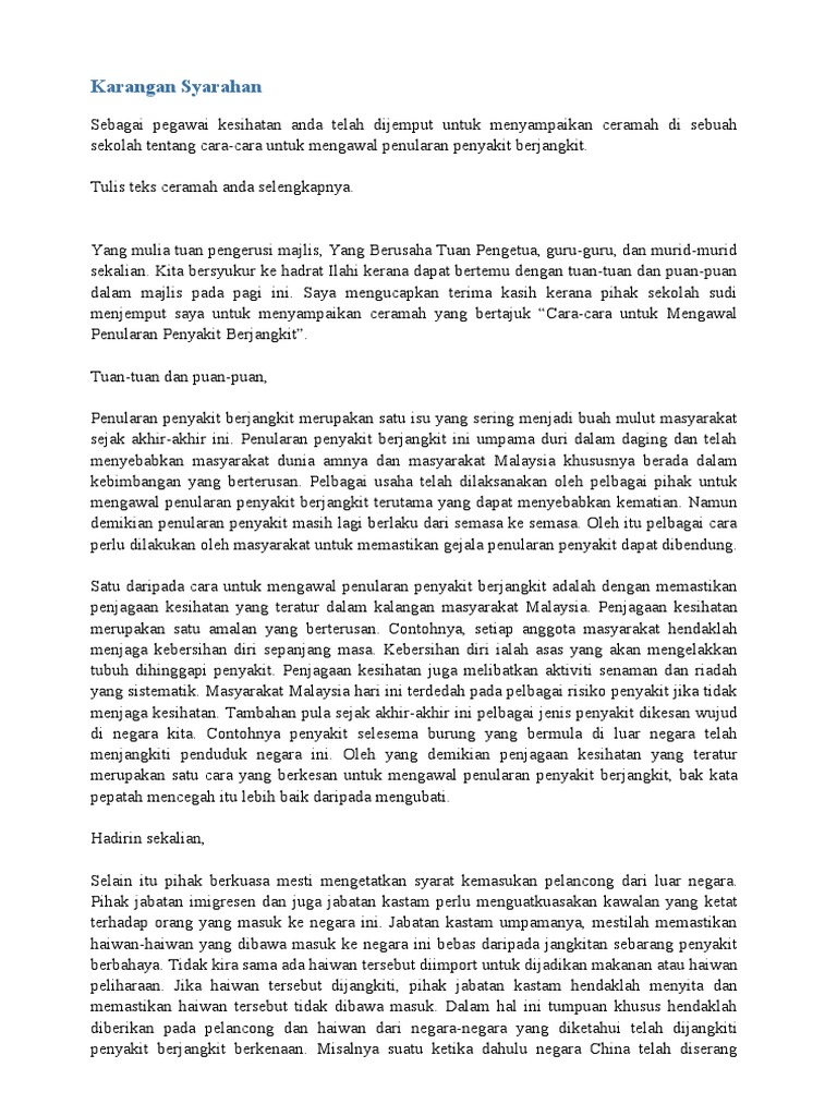 Penyakit ini boleh membawa maut. Mengawalan penularan penyakit berjangkit Format - ceramah Karangan contoh- Yang Berusaha Tuan Pengetua SMK Dato Syed Esa Puan Hjh Rohana bt Esmail Yang dihormati barisan Guru. Kekurangan vaksin atau ubat.